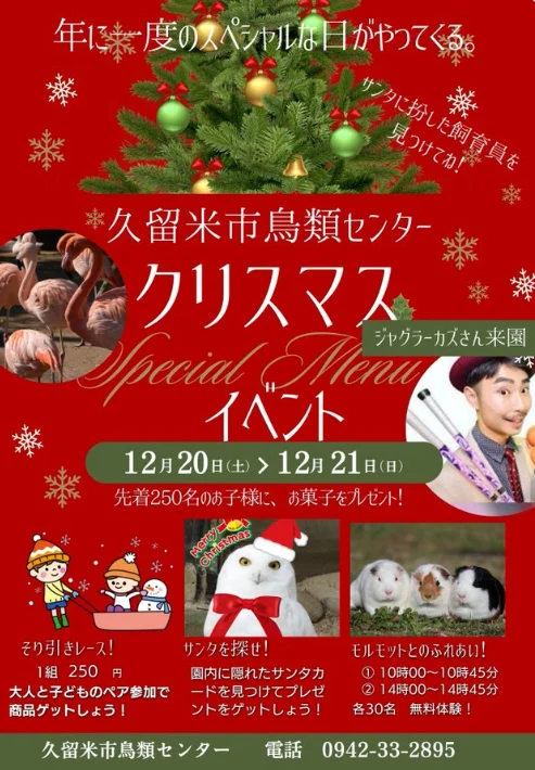 久留米の冬の風物詩といえば、鳥類センターのクリスマスイベント。2025年12月20日(土)、21日(日)の2日間、家族みんなで楽しめる企画が盛りだくさんです。 📅 開催概要【久留米市鳥類センター】 日程:2025年12月20日(土)、21日(日) 時間:9:00~17...
